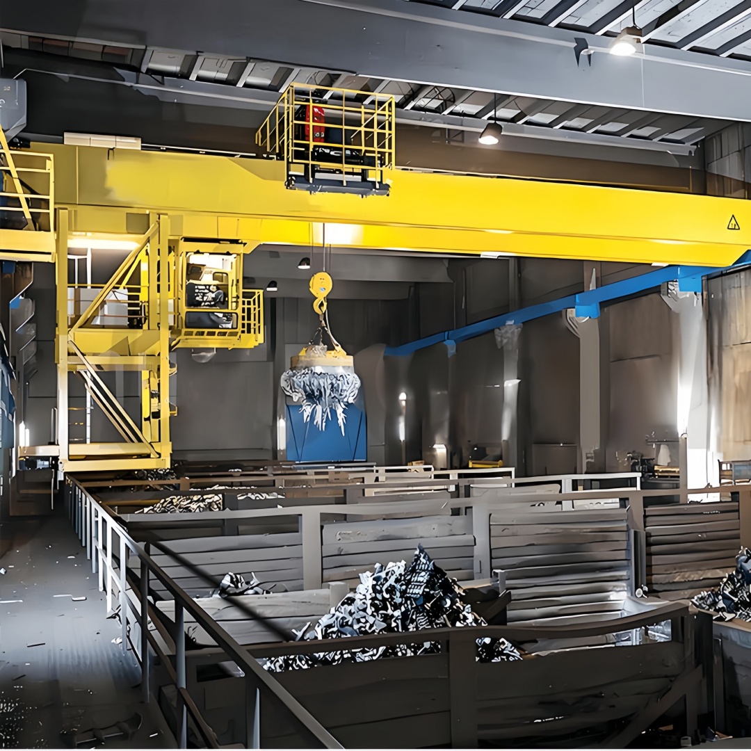 QC 型電磁橋式起重機是搭載電磁吸盤的橋式起重設(shè)備,以雙梁橋架為主體結(jié)構(gòu)(主梁與端梁連接成橋式框架),核心配置 “電動葫蘆 + 電磁吸盤” 起升單元;通過端梁沿廠房軌道的縱向運行、小車沿主梁翼緣的橫向移動,結(jié)合電磁吸盤的 “勵磁吸附 / 退磁釋放” 動作,實現(xiàn)導磁性金屬物料(廢鋼、鐵錠、鋼坯等)的無捆扎快速吊運。因其適配散料 / 工件的高效裝卸需求,已成為廢品回收、鋼鐵加工、機械制造車間的常用起重設(shè)備。